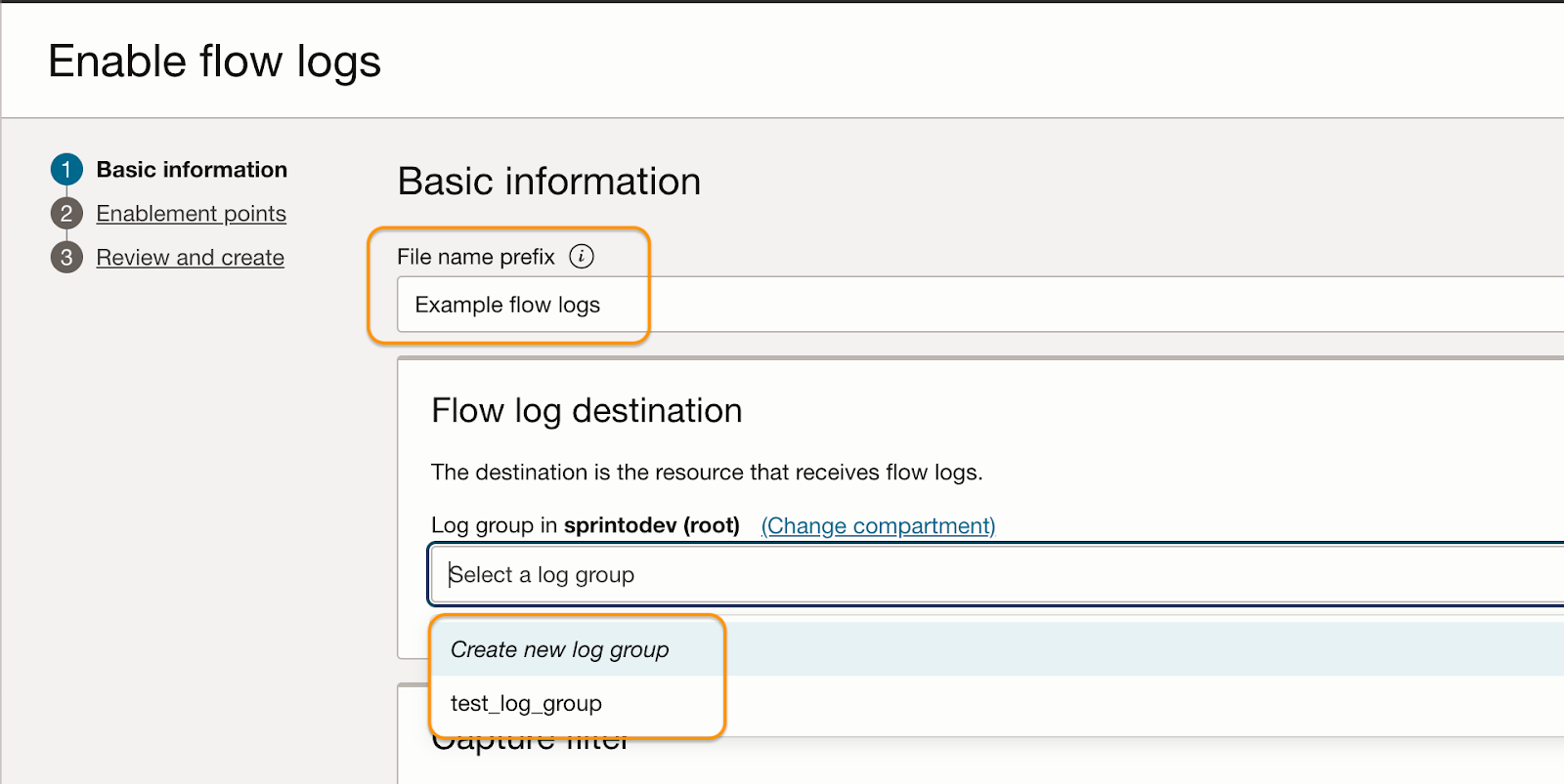 4. On Enable flow logs page, enter a file name and select a log group to capture the flow logs. If you don’t have a log group created previously, you can create a new one.<br>