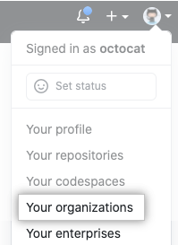 1. In the top right corner of GitHub.com, click your profile photo, then click **Your organizations**.