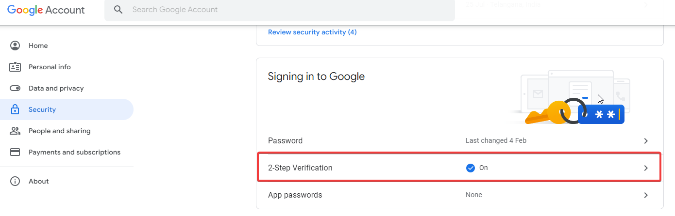 3. Under “Signing in to Google,” select **2-Step Verification** ![and then](https://s3.amazonaws.com/cdn.freshdesk.com/data/helpdesk/attachments/production/72015534537/original/x7E7h9IVlTRnwWYuBdG_79ksU8Sl0M0tpQ.png?1658821669) **Get started**.<br>