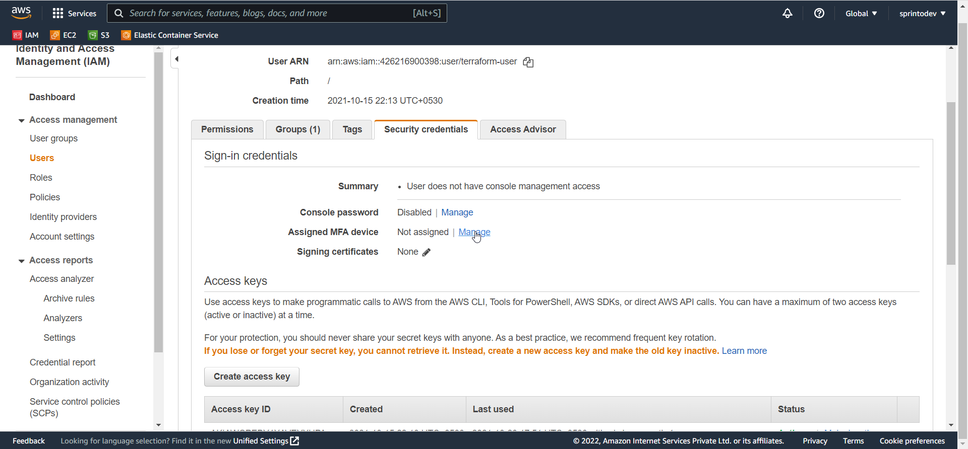 Choose the Security credentials tab. Next to Assigned MFA device, choose Manage.