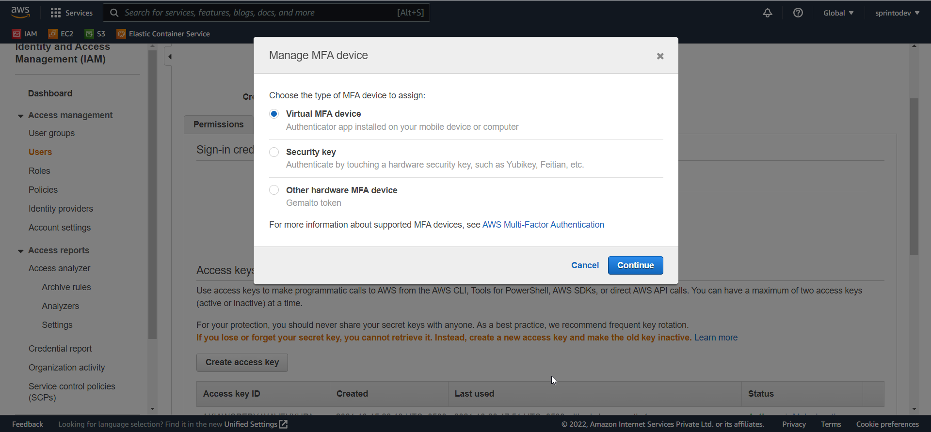In the Manage MFA Device wizard, choose Virtual MFA device, and then choose Continue.