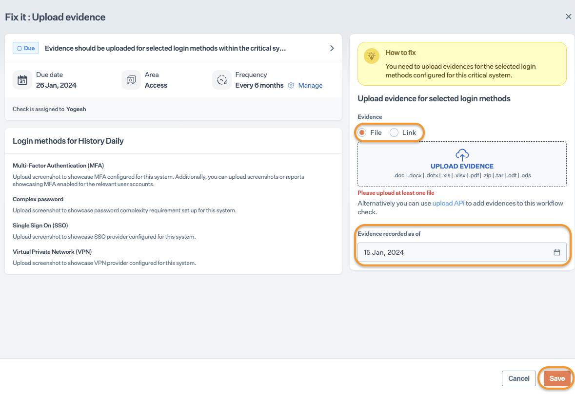 To resolve this check, you need to upload evidence for the login protection methods configured for the critical system.