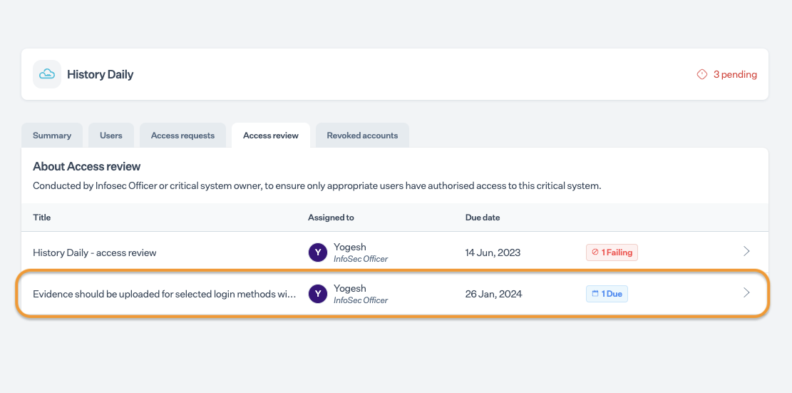 3. Choose the Access Review tab and select the Evidence should be uploaded for selected login methods within the critical system {critical system name} check.