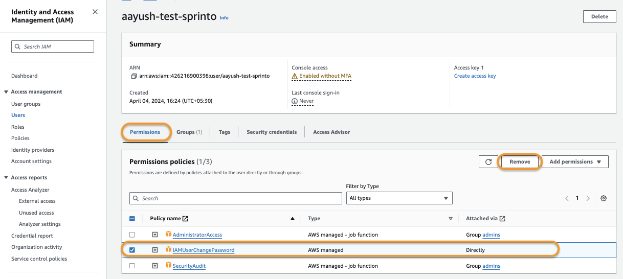 If you find any user with an IAM policy attached, select the checkbox next to the policy and click Remove to detach the policy from the user.