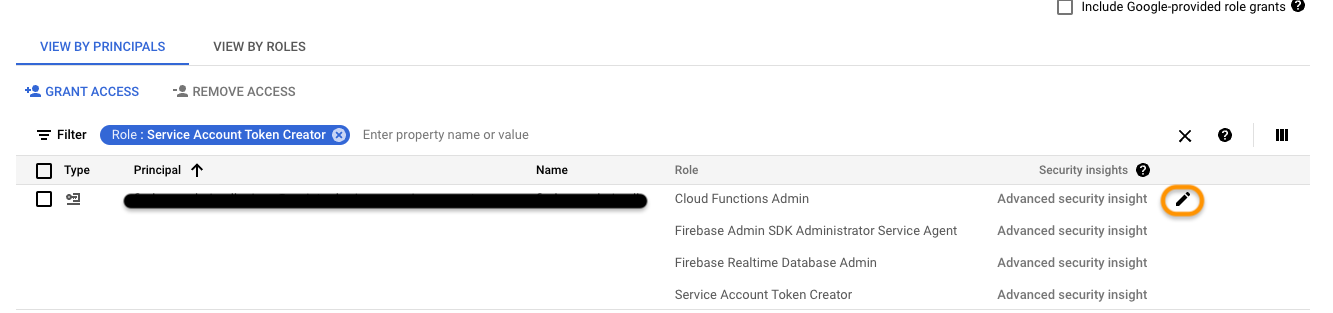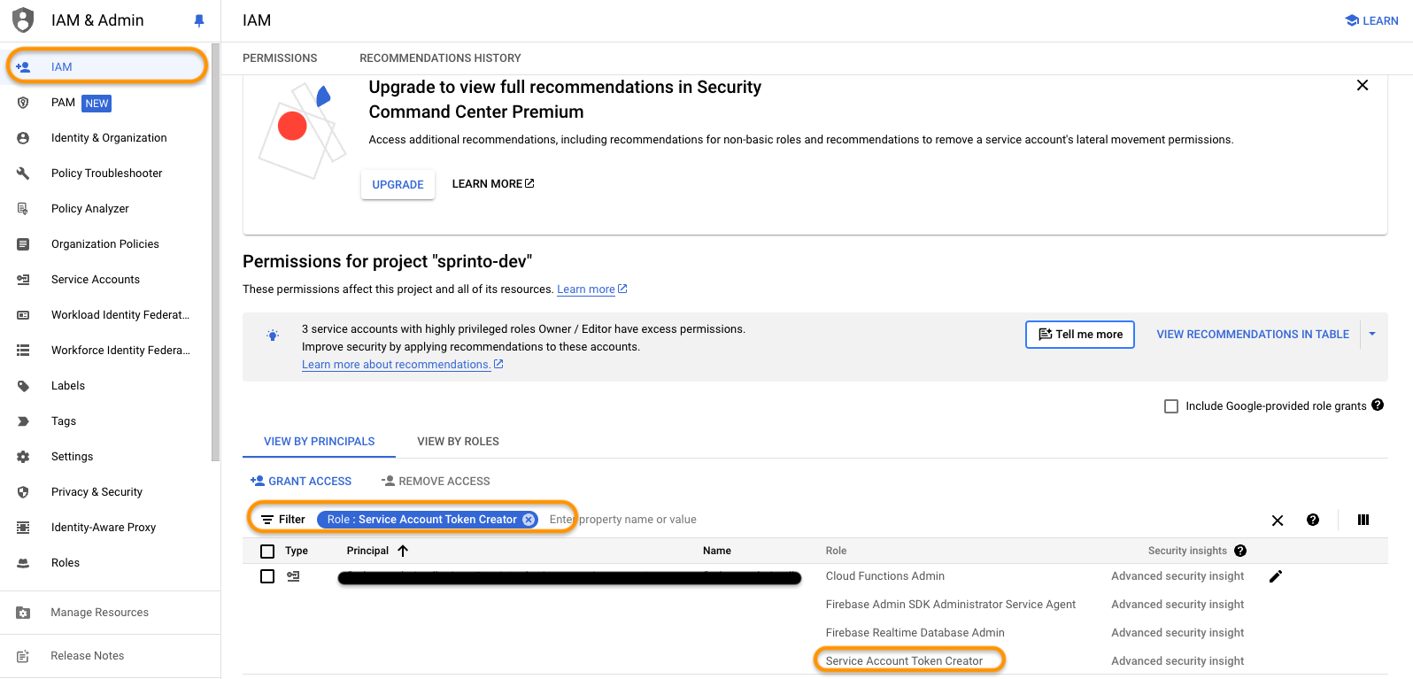 3. Review the accounts list and ensure there is no IAM user with roles like "Service Account User" or "Service Account Token Creator" assigned at the project level. Use the filter field and enter Role: Service Account User or Role: Service Account Token Creator for quick navigation.