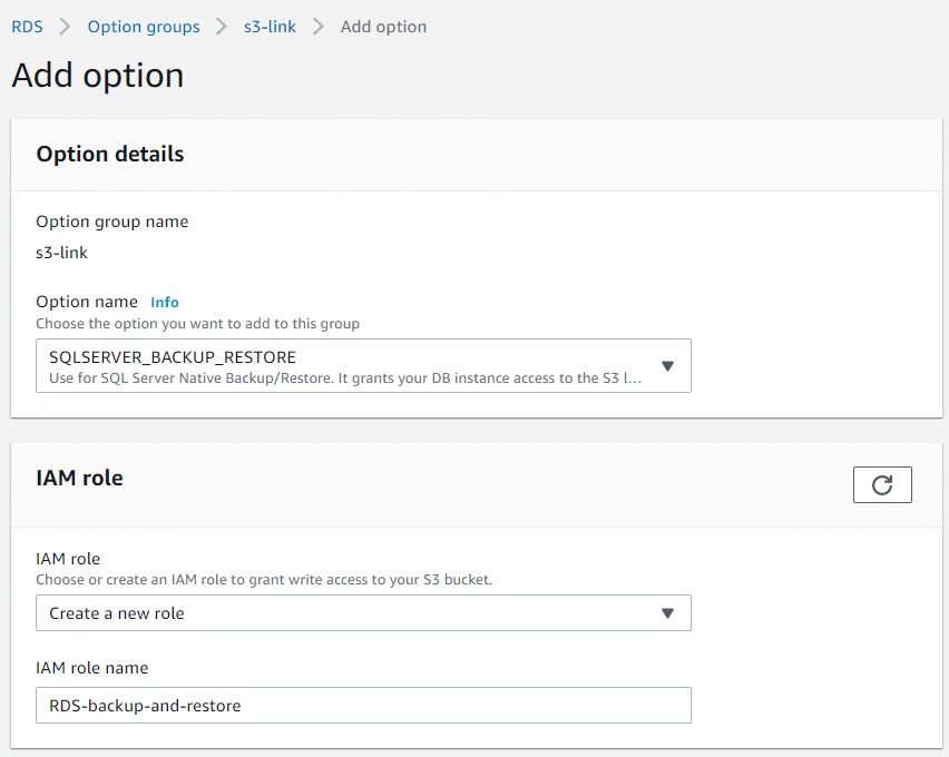 Specify “SQLSERVER_BACKUP_RESTORE” and choose to create a new role in the “IAM role” section. In this case, the role with all the necessary permissions will be created.