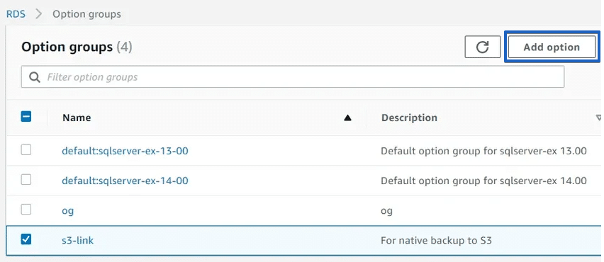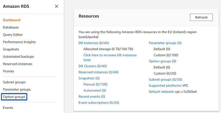 Open AWS RDS Console and go to the Option Groups section