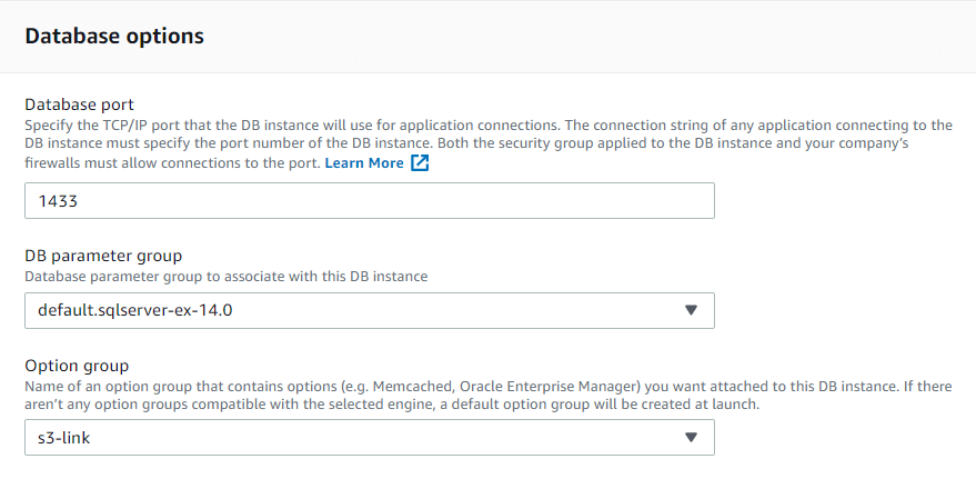 Now set the “Option Group” option in a database’s settings. To do this choose a database from the list and click “Modify”. In the “Database Option” section, specify the “Option Group” that was created.