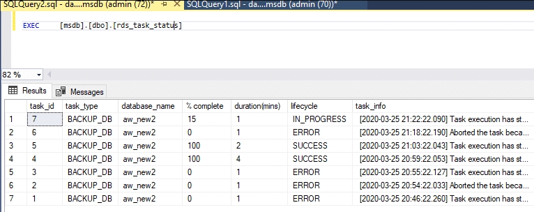 To track the backup process, execute another procedure EXEC [msdb]. [Dbo]. [Rds_task_status]