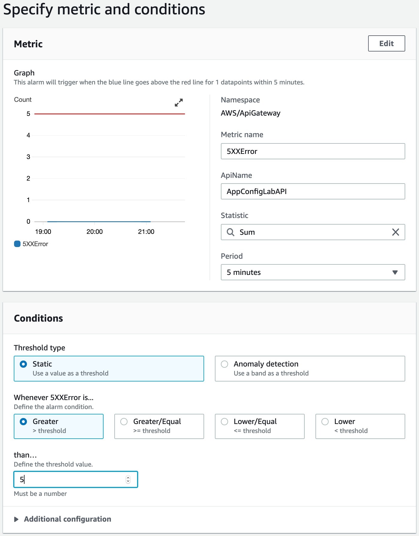 8. Enter AppConfig-API-5XX-Alarm in the Name field and provide an optional Alarm description.