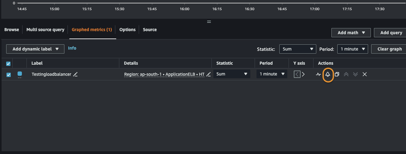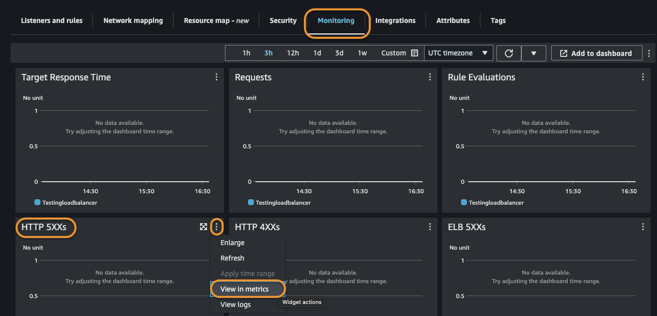 On the load balancer page, Select the Monitoring tab, then select View in metric for ELB 5XXs metric.