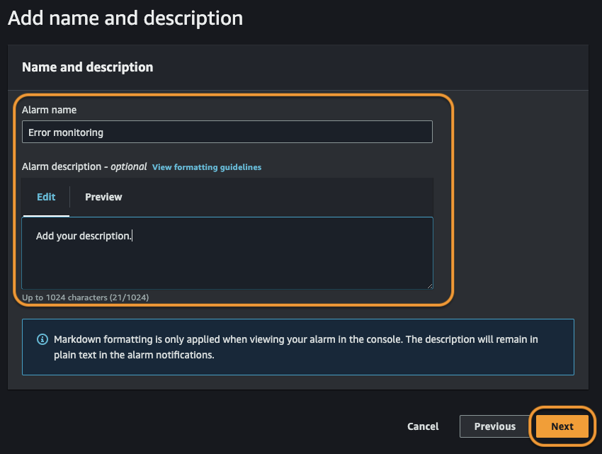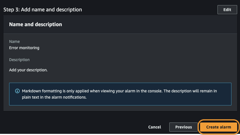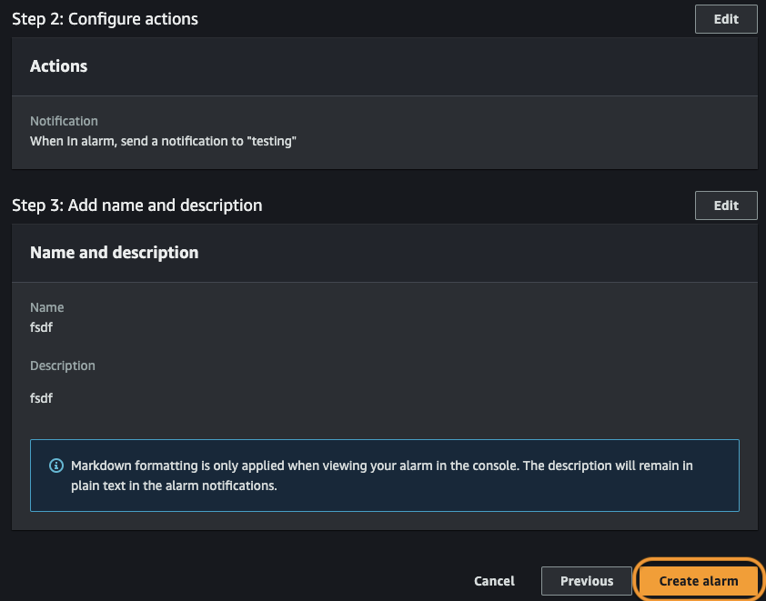 Preview your created alarm and edit any parameters if required, then click Create Alarm.