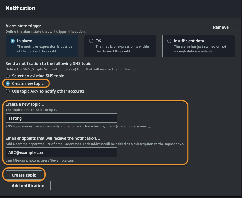 Create New Topic: Enter the topic name and email address for alert notifications. Ensure your created topic gets selected for notification.