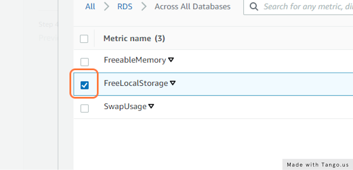 To address this check, follow the steps below to create an AWS CloudWatch alert for monitoring AWS RDS database free space.