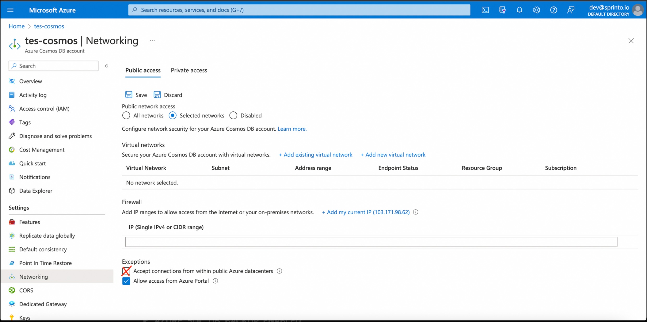 To resolve the check, follow the steps below to configure Azure Cosmos DB and restrict public access: