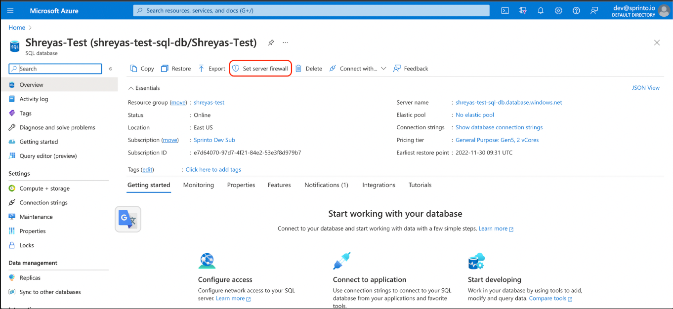 3. Choose the respective SQL database and click Set server firewall.
