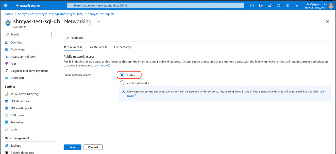 # How to resolve Sprinto check for protecting Azure SQL Database from public access