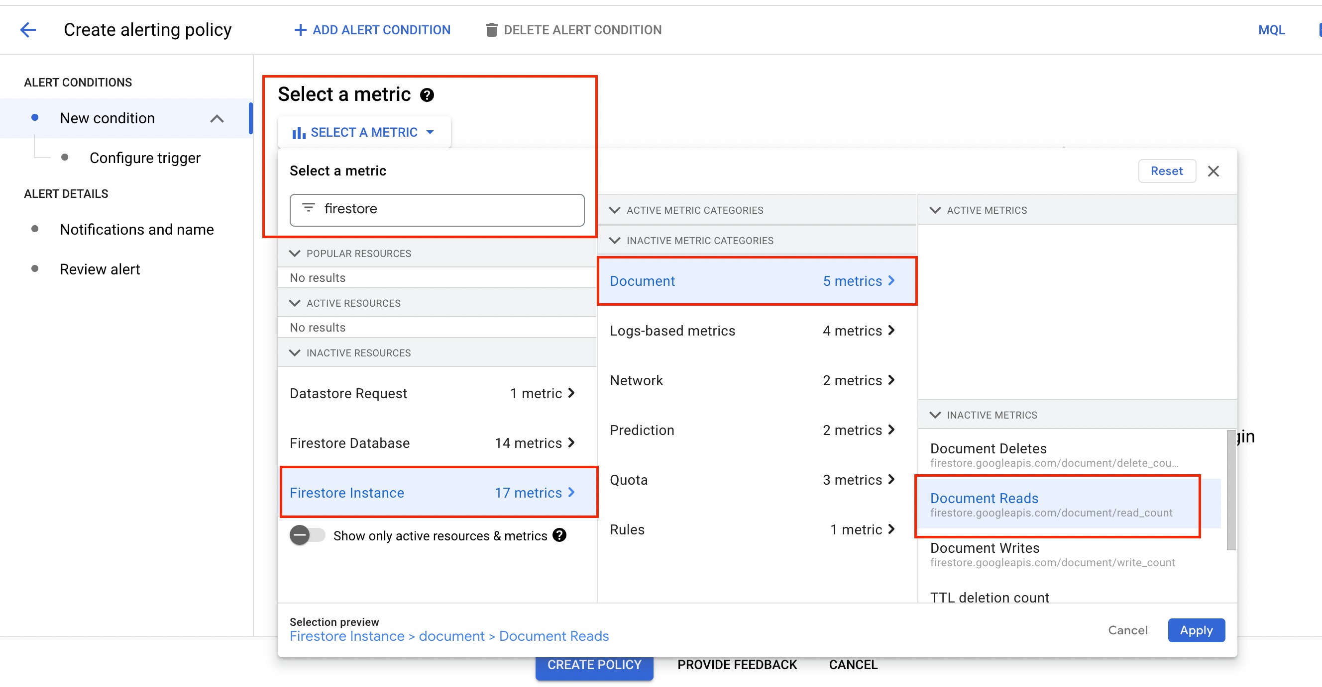 5. From the dropdown menu, select Firestore, then go to Firestore Instance > Document > Document Reads and click Apply.