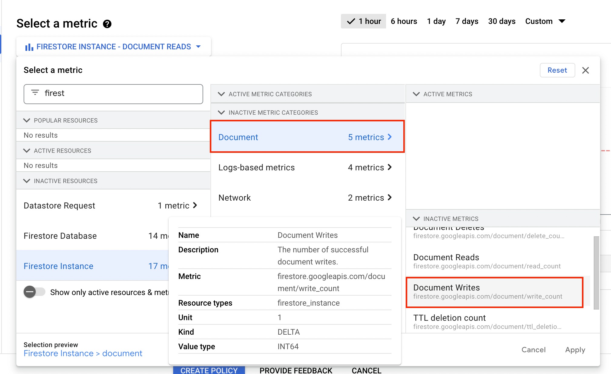 From the dropdown menu, select Firestore. Navigate to Firestore Instance > Document > Document Writes and click Apply.