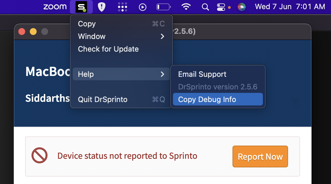 Right-click the Dr. Sprinto icon from the top bar, then navigate to Help > Copy Debug Info.