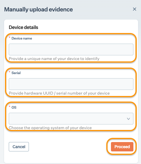 Enter your Device name, Device serial number, and Operating system, then click Proceed.