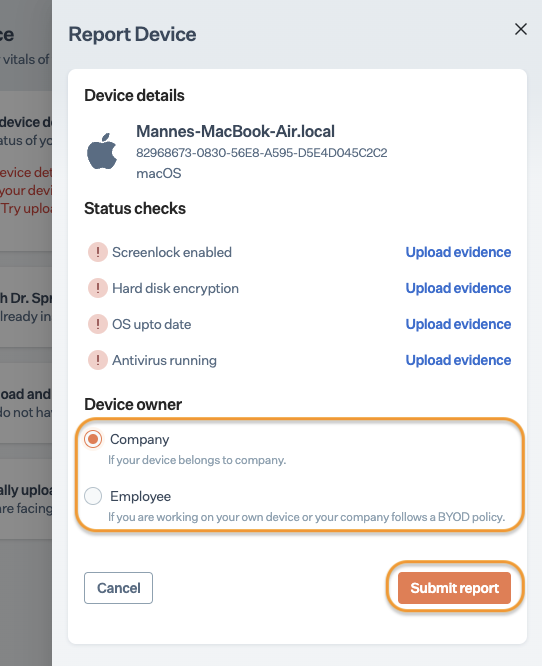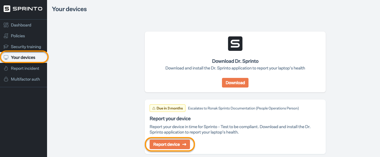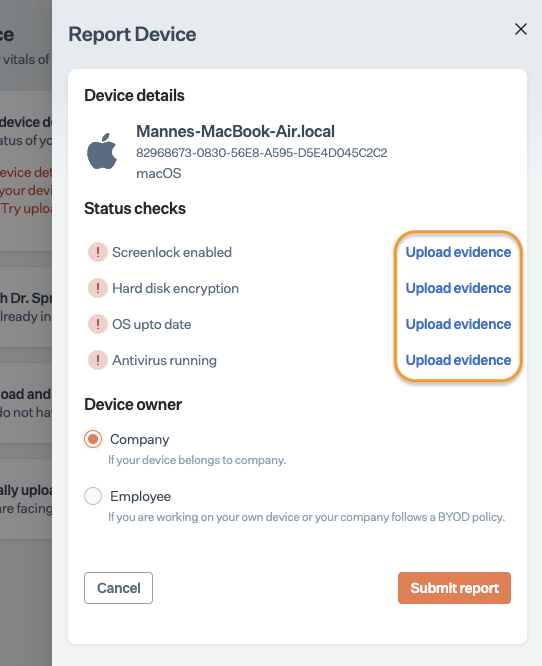 If you encounter an error working with Dr. Sprinto, and Dr. Sprinto cannot fetch your device health status automatically due to configuration issues or unsupported operating systems, you can report your device status manually through the Sprinto app. To know more about manual reporting and the evidence you will need to report your device, refer to What is manual reporting to learn more.