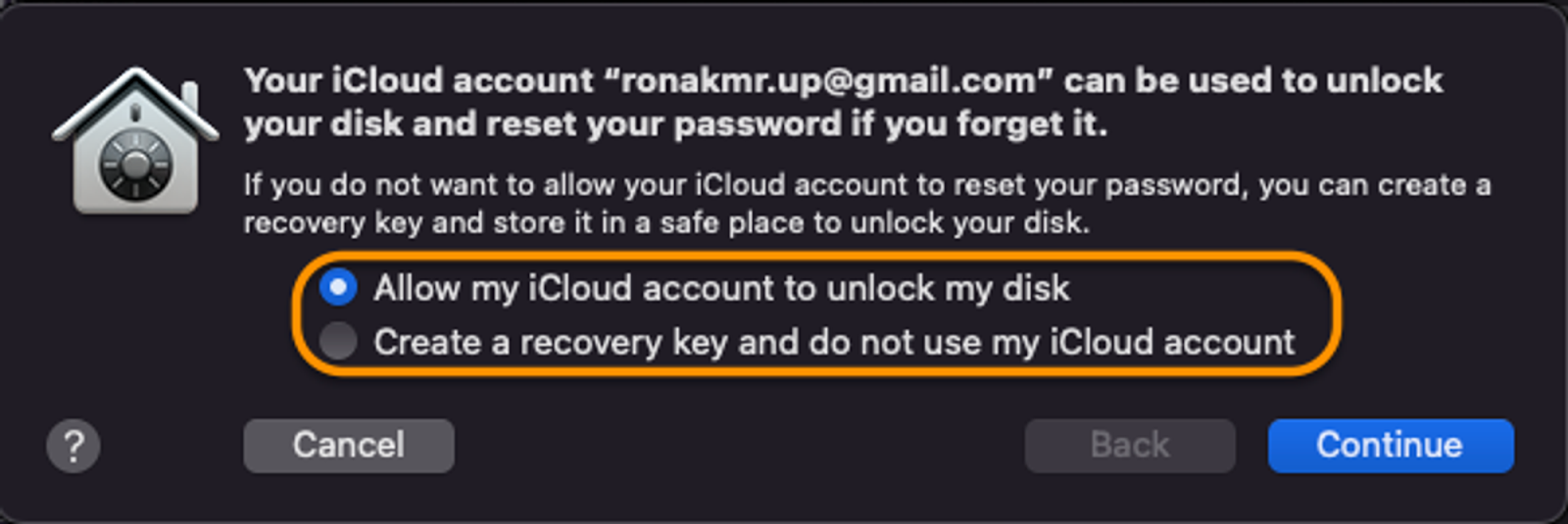 Select a disk recovery method, then click Continue. Note: We recommend using iCloud-based recovery if you use the service; otherwise, select the Recovery key-based method.