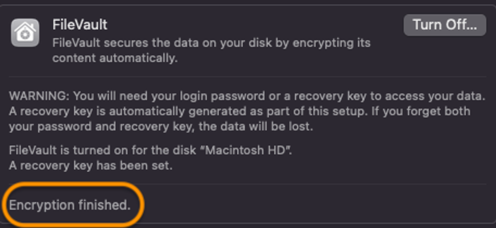 Disk encryption starts. Depending on your disk storage size, it may take a few minutes. Upon completion, you will see the "Encryption finished" message displayed.