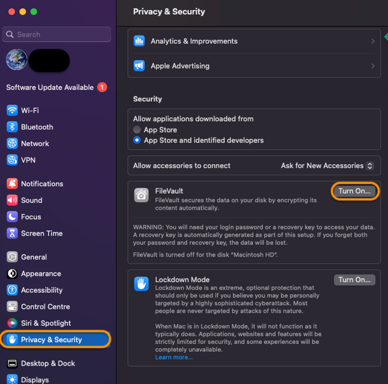 Click Turn On.. to enable FileVault.