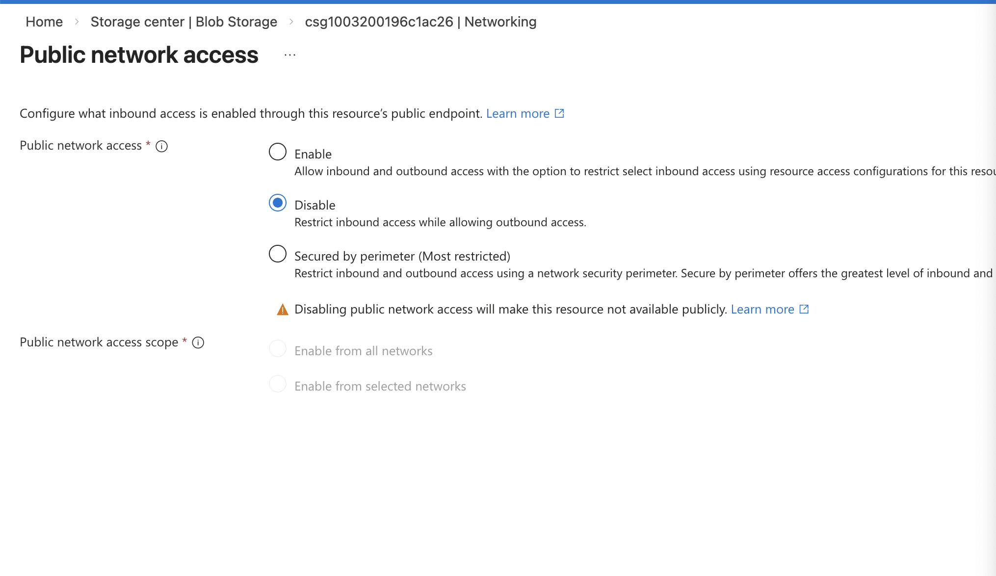 * Choosing **Disable** blocks all public network access and allows access only through **private endpoints**.