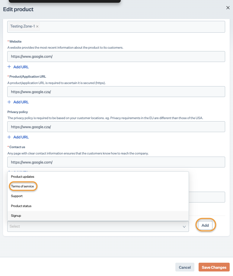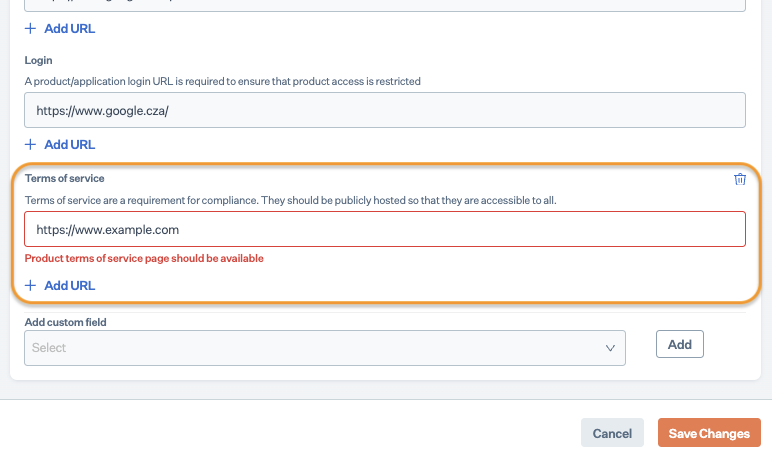 5. On the Product Details page, enter a valid Terms of service page URL in the respective field, then click Save Changes. Click Add URL for additional URL fields. \