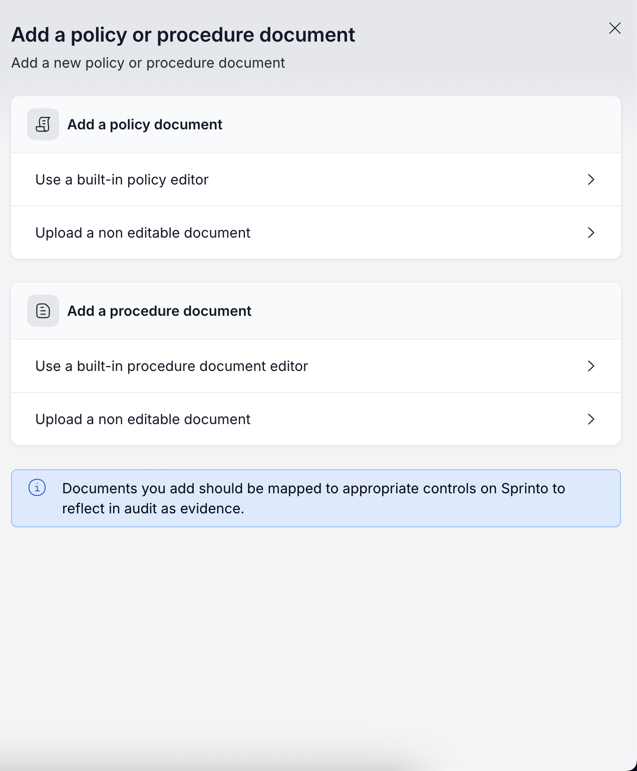 Learn how to create and upload policies, procedures, and supporting documents in Sprinto.