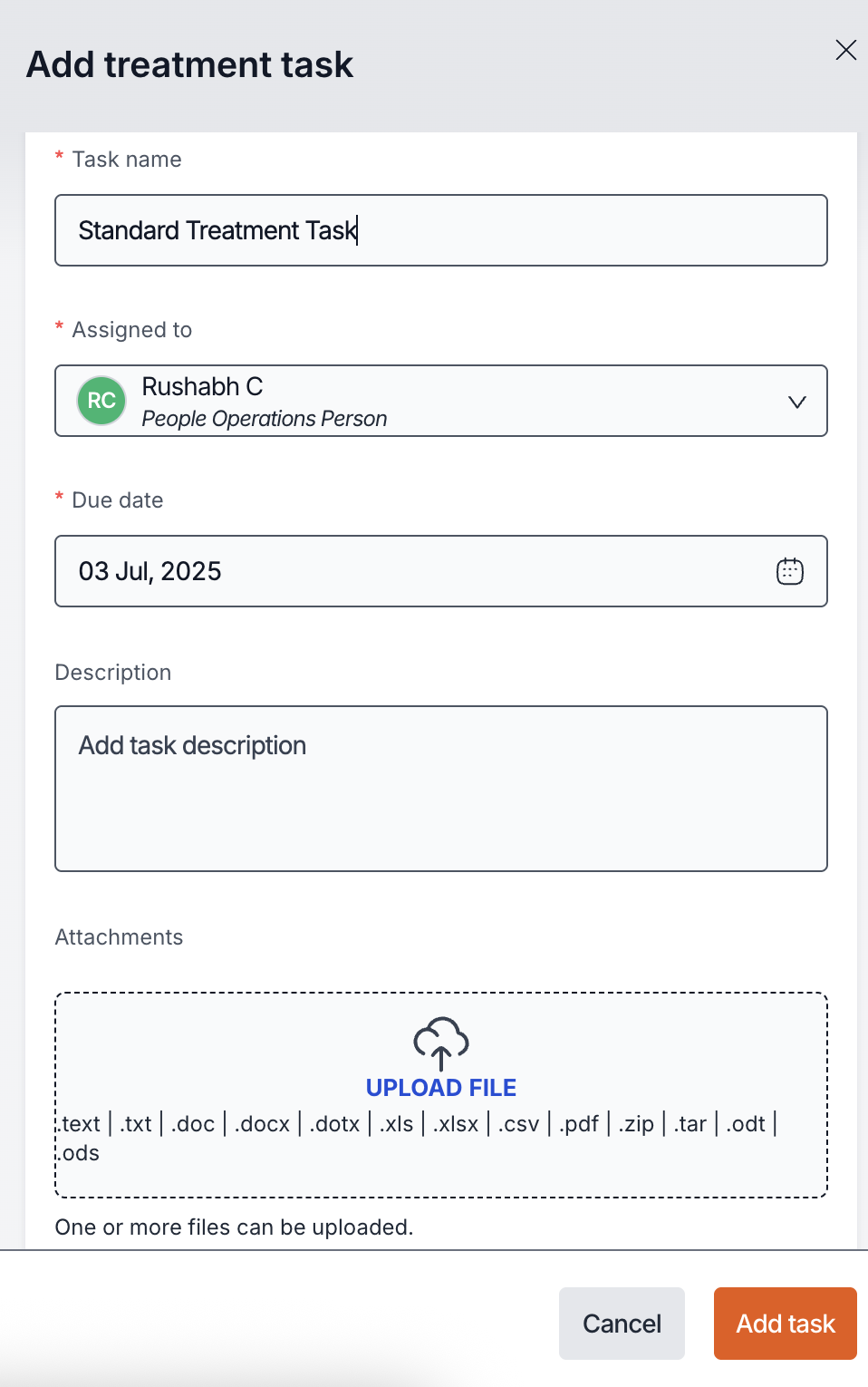 1. In the **Treatment** section, click **+ Add Task**.