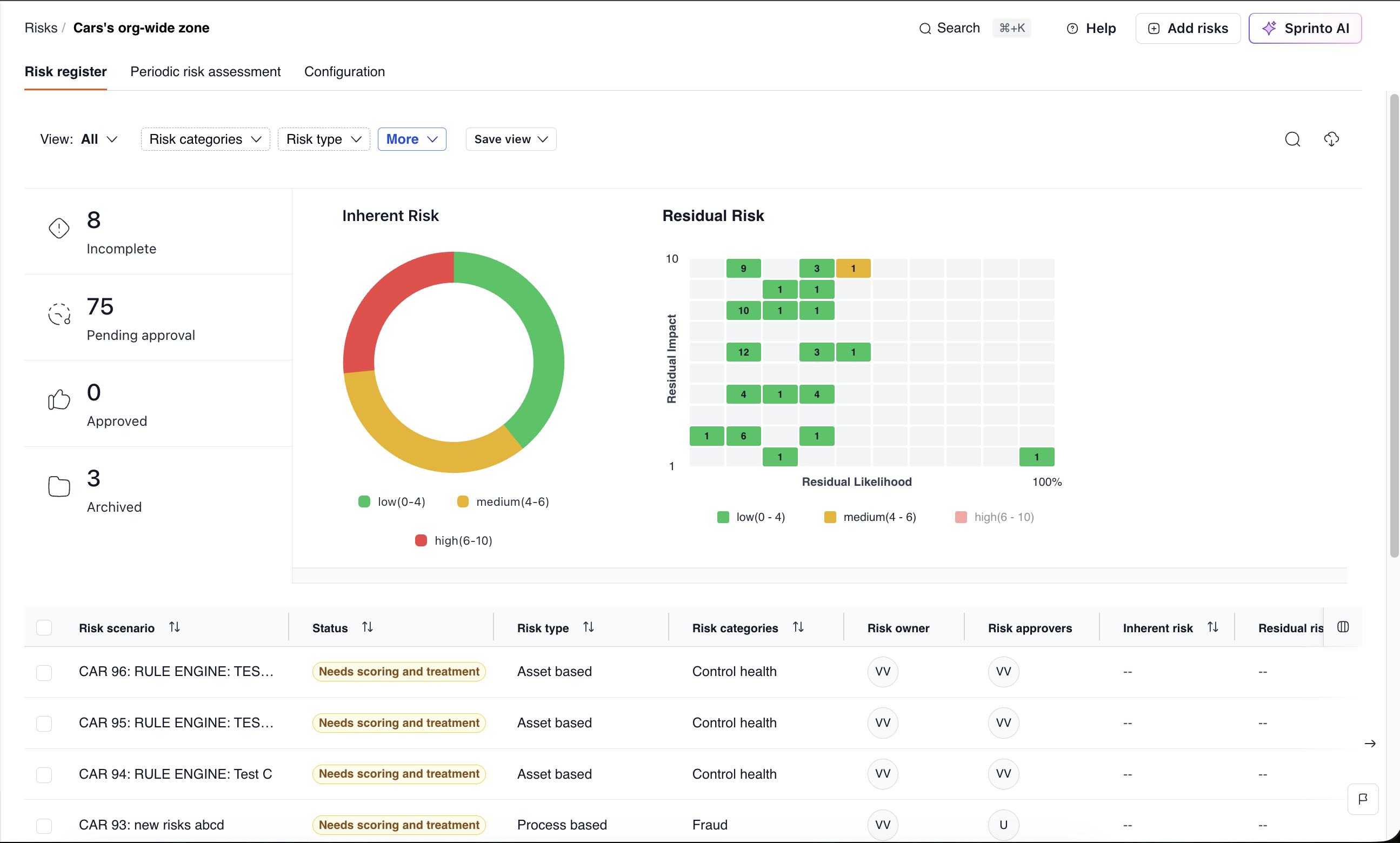 You can customise the risk charts displayed on the Risk register page to control how risk data is visualised across your organisation. Sprinto lets you configure up to three charts, allowing you to focus on the risk metrics that matter most.