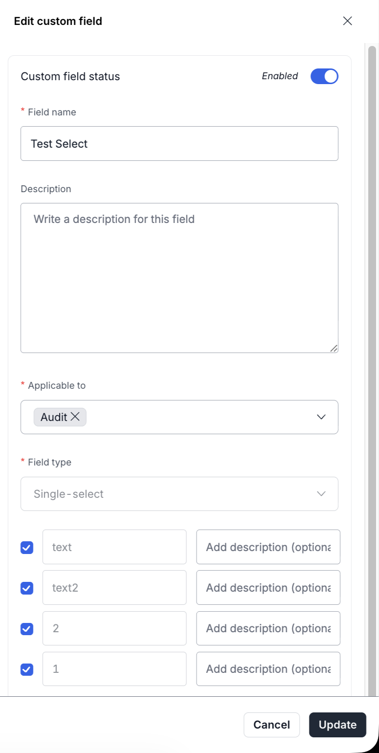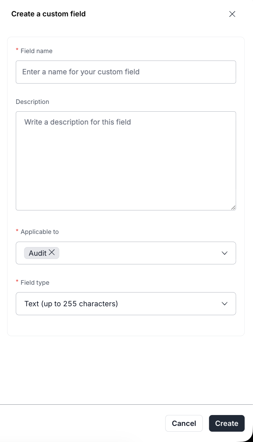 <table><thead><tr><th width="120.58203125">Field Type</th><th width="372.90234375">Description</th><th>Example Use Case</th></tr></thead><tbody><tr><td>Text</td><td>Accepts free-form text (single or multiple lines).</td><td>Department name, project code</td></tr><tr><td>Number</td><td>Accepts numeric values.</td><td>Risk ID, employee count</td></tr><tr><td>Percentage</td><td>Accepts values in percentage format.</td><td>Risk treatment completion</td></tr><tr><td>Date</td><td>Accepts date inputs.</td><td>Policy expiry date</td></tr><tr><td>Single-select</td><td>Allows selection of one value from predefined options.</td><td>Risk severity levels</td></tr><tr><td>Multi-select</td><td>Allows selection of multiple predefined options.</td><td>Applicable frameworks</td></tr><tr><td>Formula</td><td>Uses operators and other field values to calculate outputs.</td><td>Risk score calculation</td></tr></tbody></table>