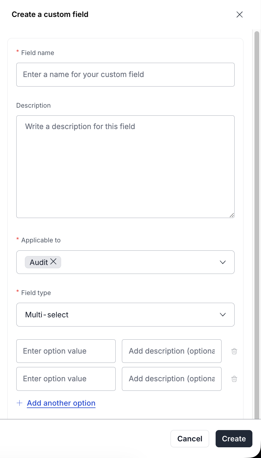 1. In the **Manage custom fields** drawer, click **Create custom field**.