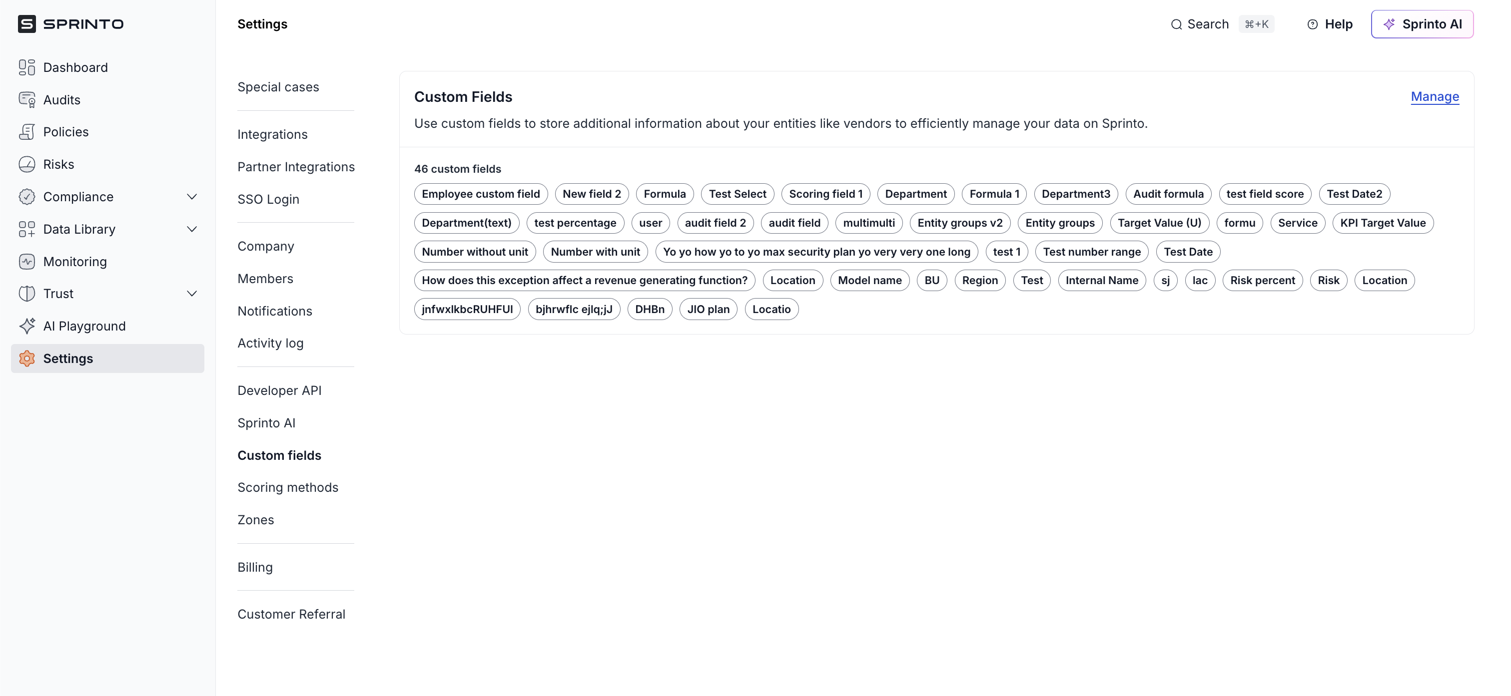 The **Custom Fields** section in Sprinto allows you to store additional information about your entities, such as vendors, risks, and policies. By defining custom attributes, you can capture data that is not available in Sprinto’s default fields. This flexibility ensures that your organisation’s unique compliance and operational requirements are met.