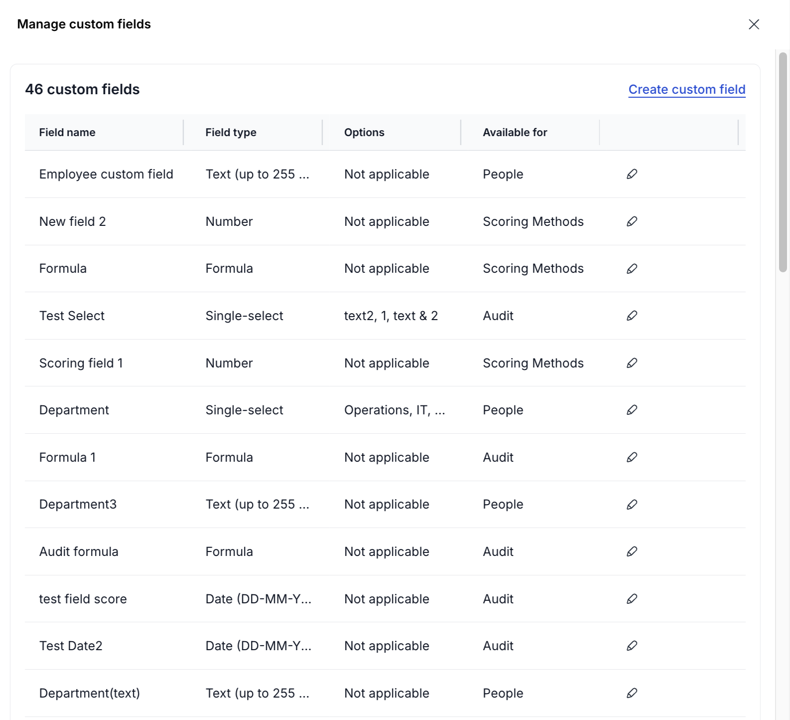 1. In the **Manage custom fields** drawer, click the **Edit** icon next to the field you want to update.